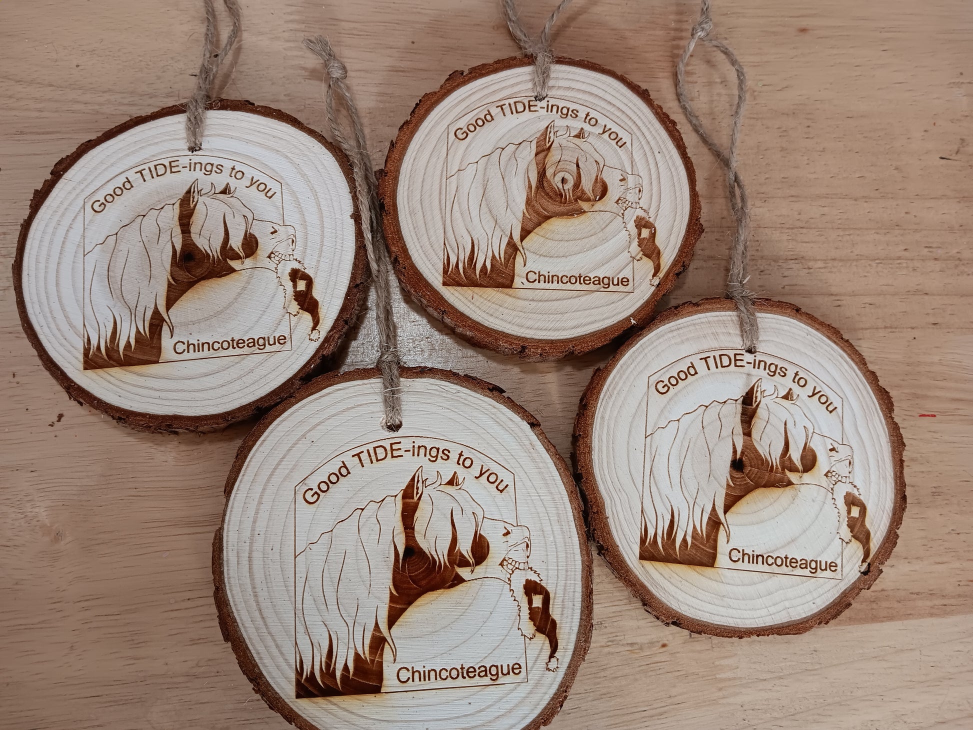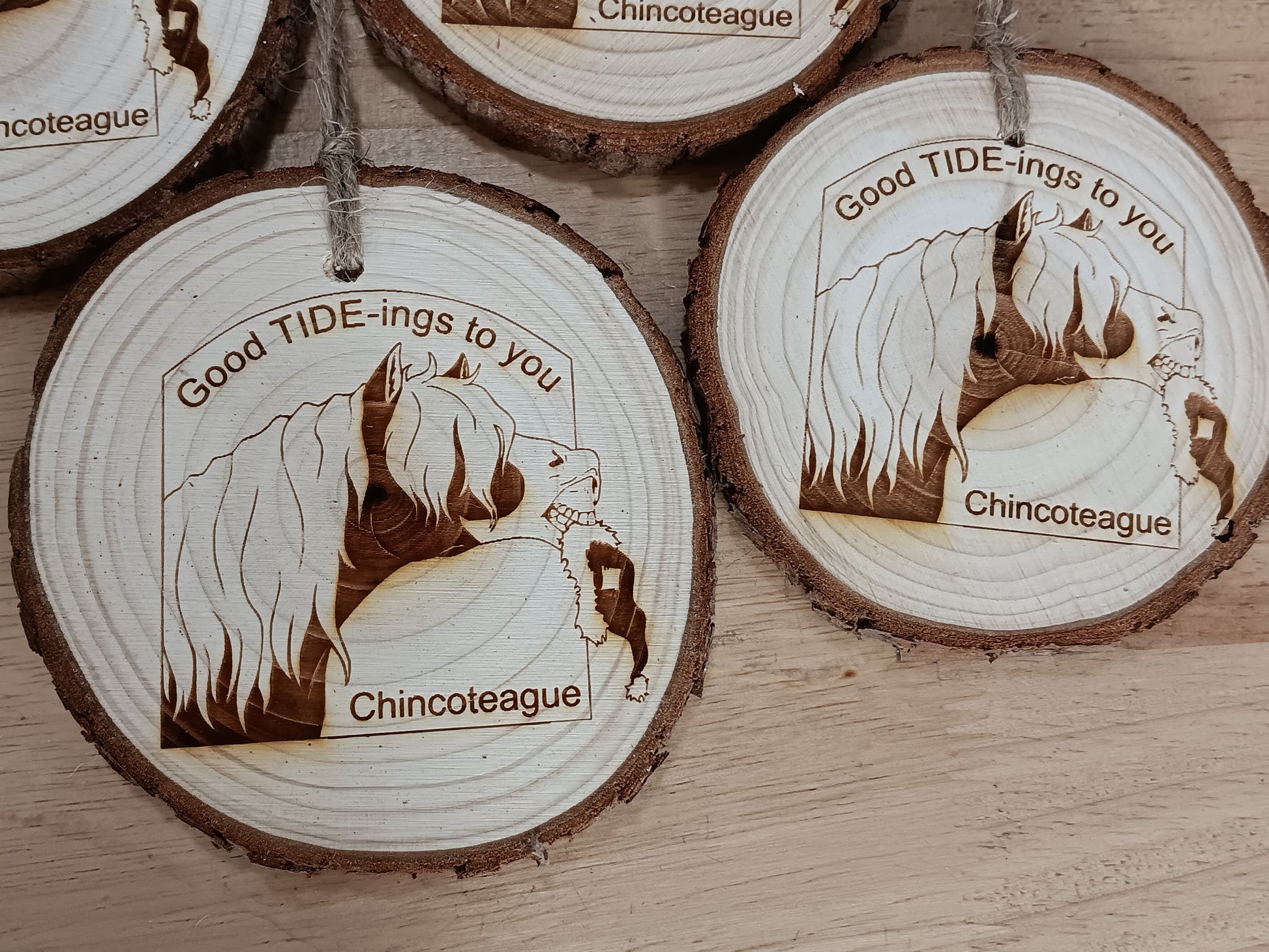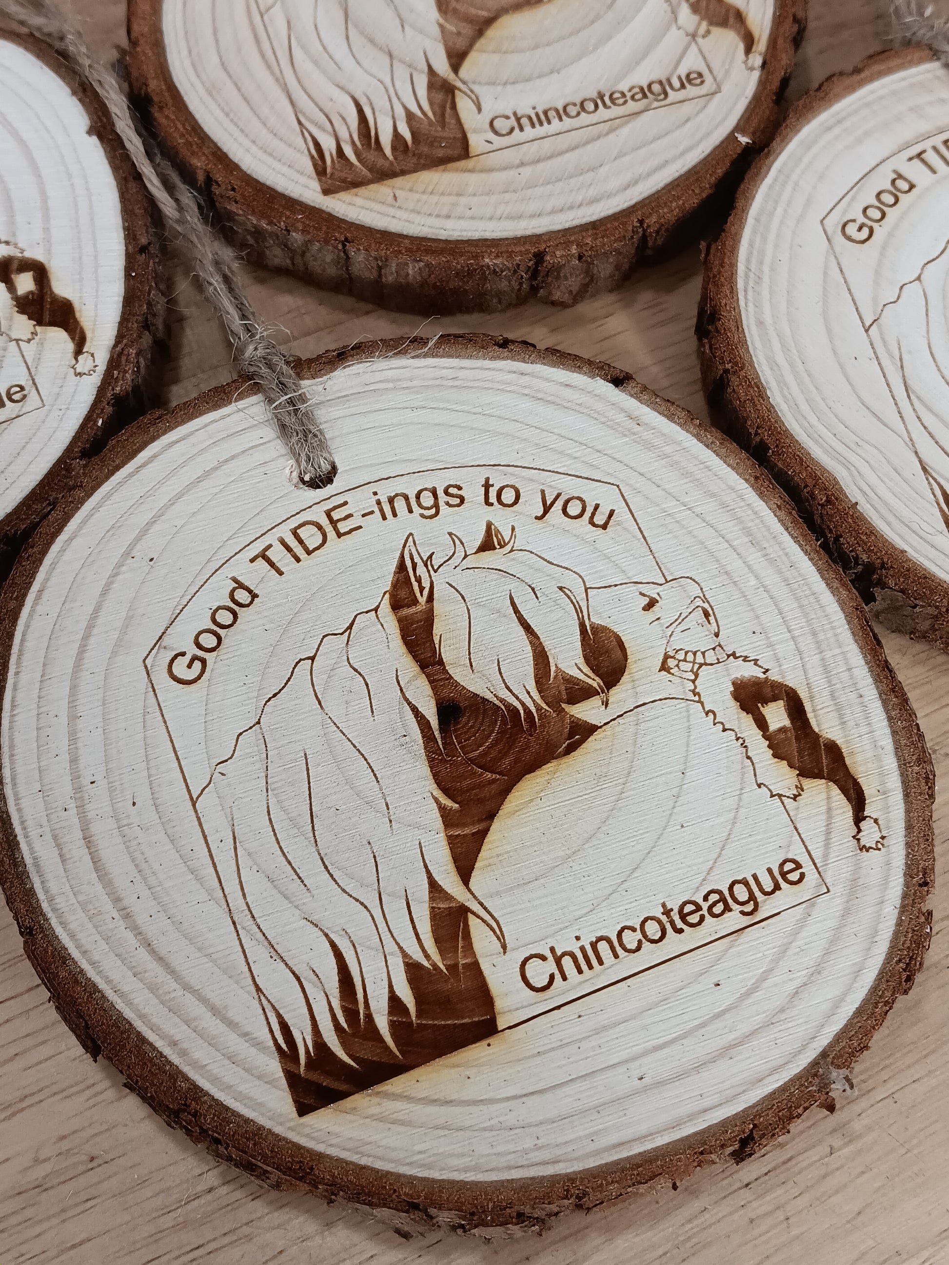 Celebrate the holiday season with Chincoteague's own favorite pony! Riptide is shown holding Santa's hat for him, I'm sure he didn't steal it! Image hand-drawn by Macey Cox exclusively for us. Says "Good Tide-ings to you" and "Chincoteague" on the front.